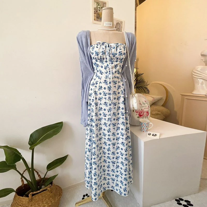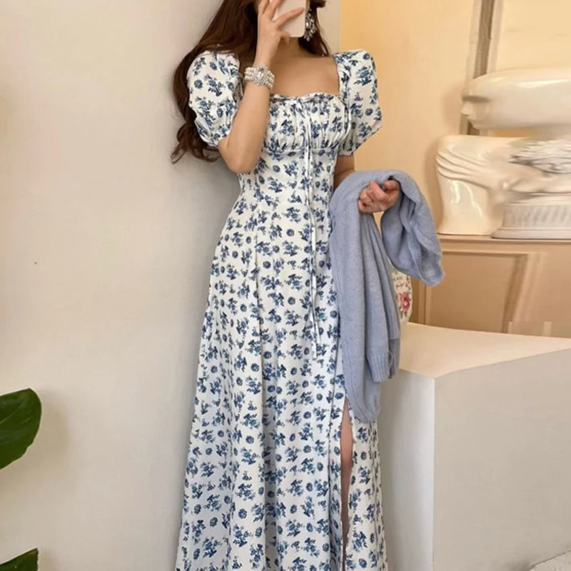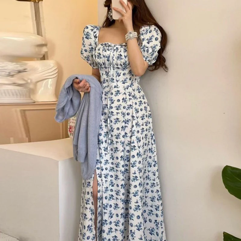Elegant Puff Sleeve Floral Print Dress Women Summer High Split Long Dresses Woman 2025 Zipper Square Collar Party Dress Female
