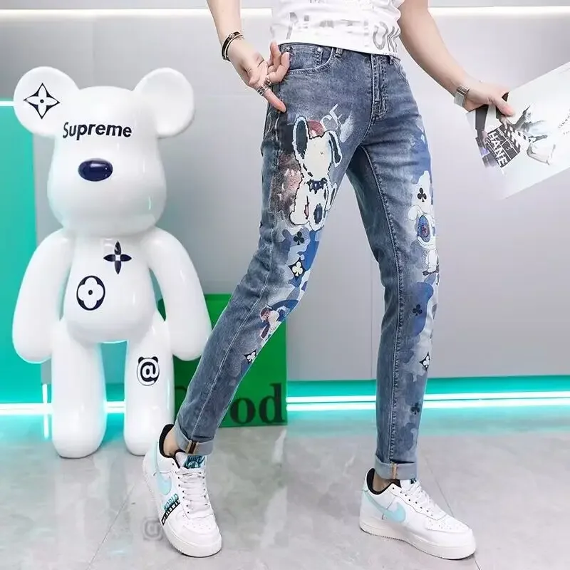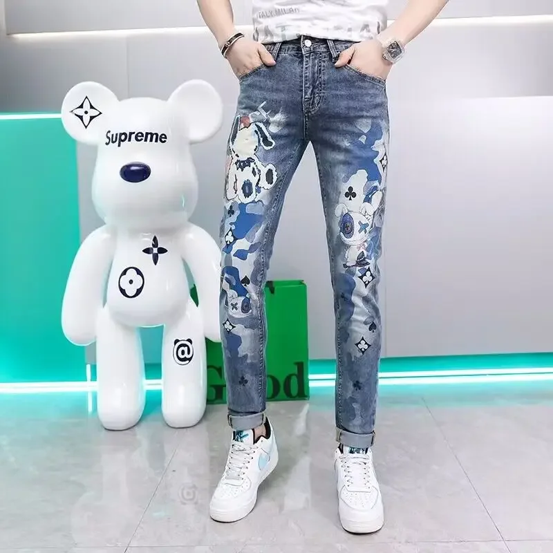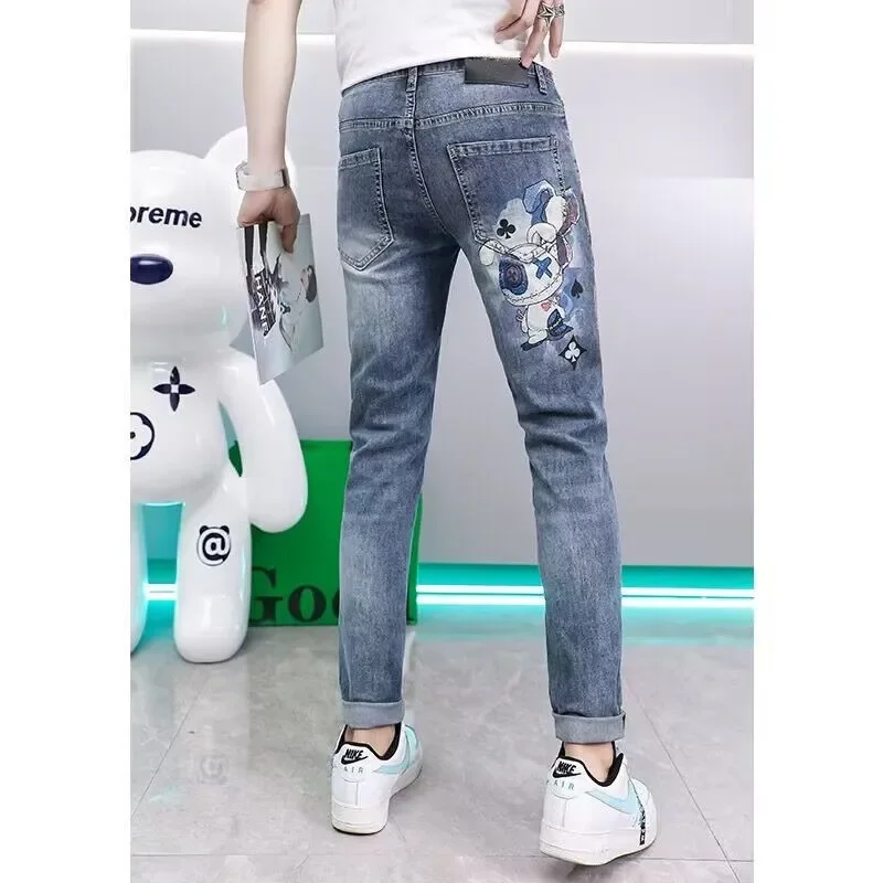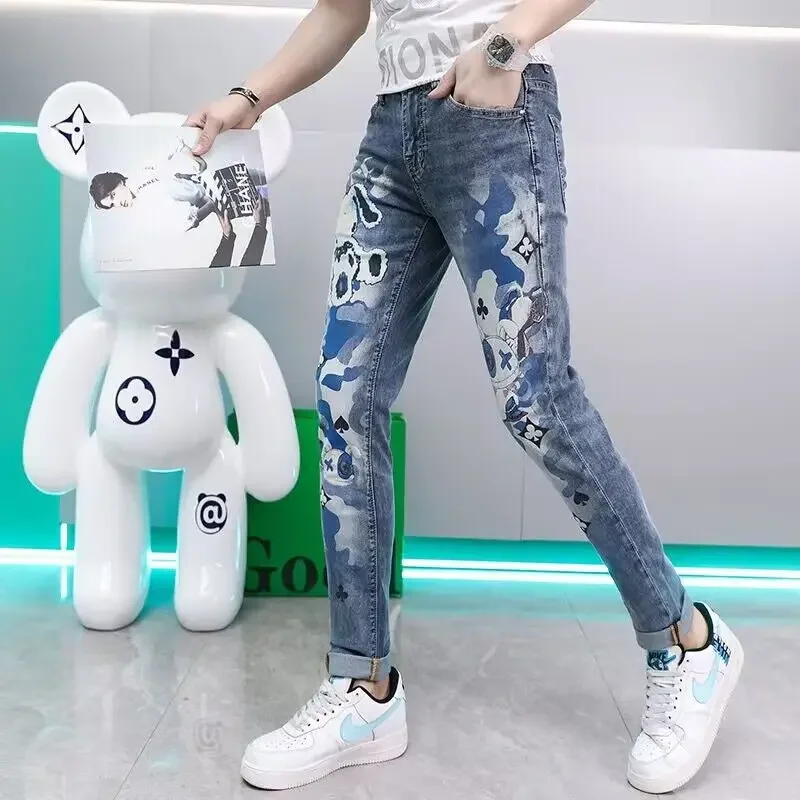 European Style Printing Jeans For Men Trendy Slim Fit Elastic Mini Pants Autumn New Casual Fashion Trousers Loose Fit