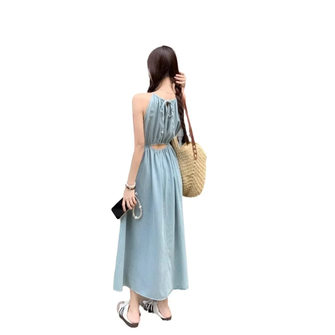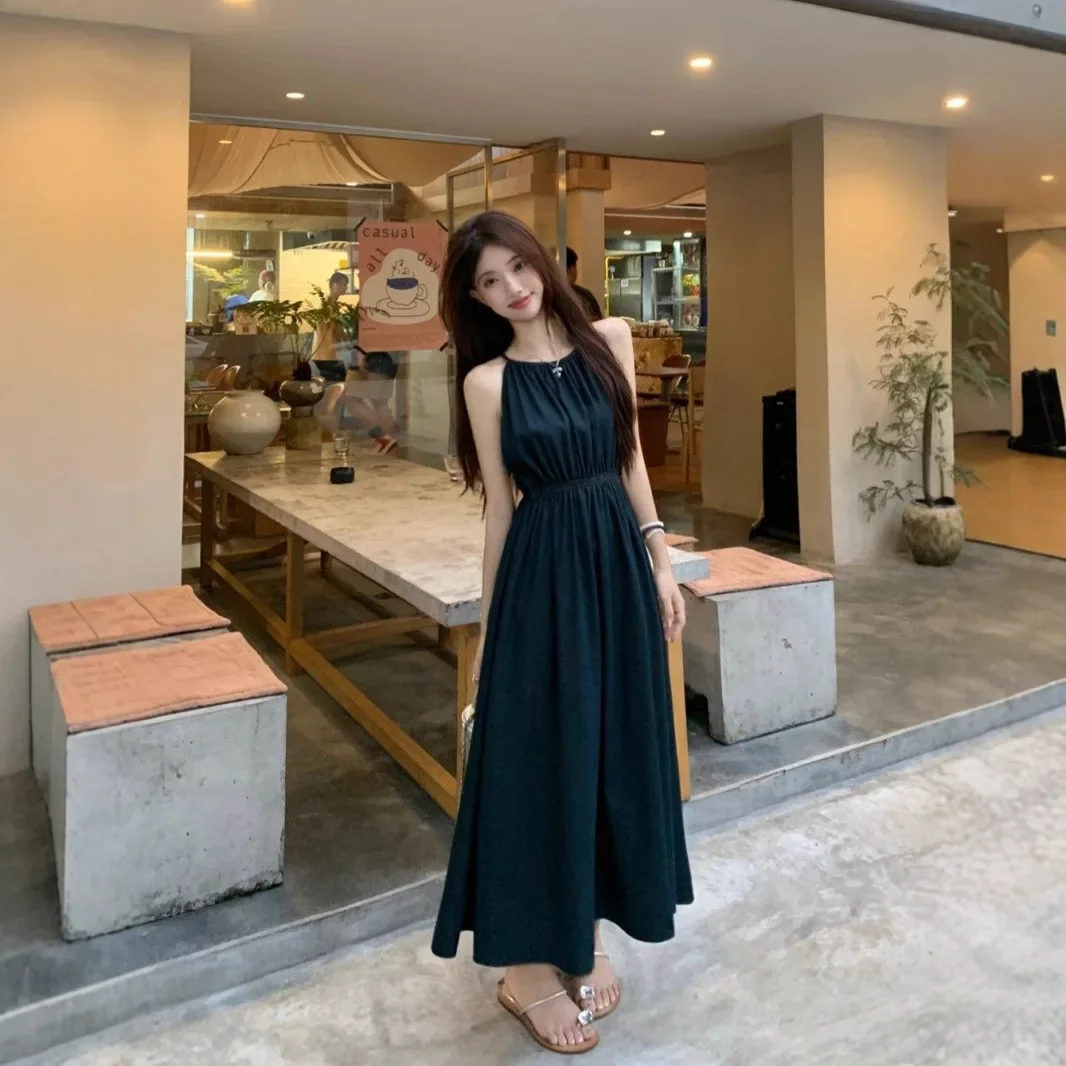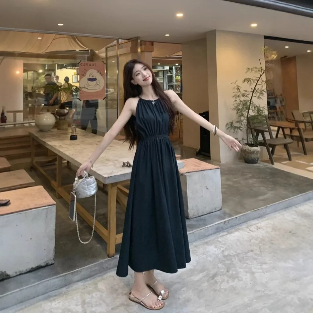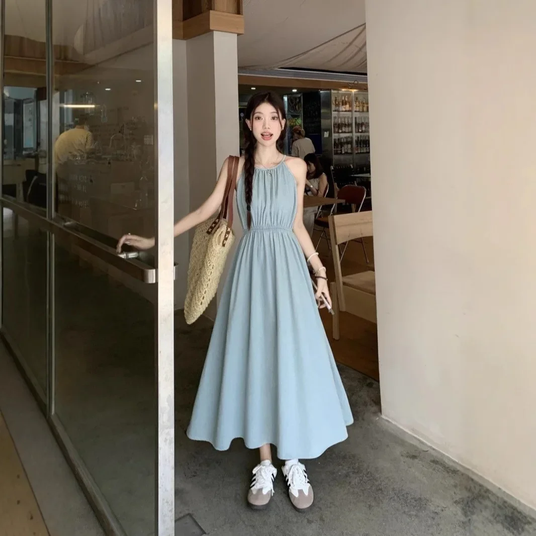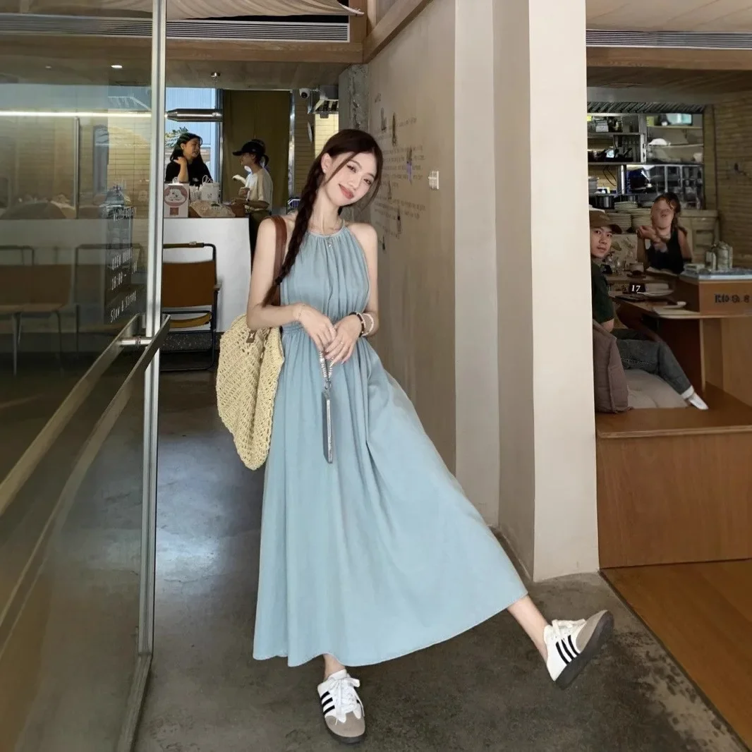 French Style Sweet Sleeveless Neck Hanging Strap Dress Women Summer 2025 New Small Size Beach Vacation Long Dress