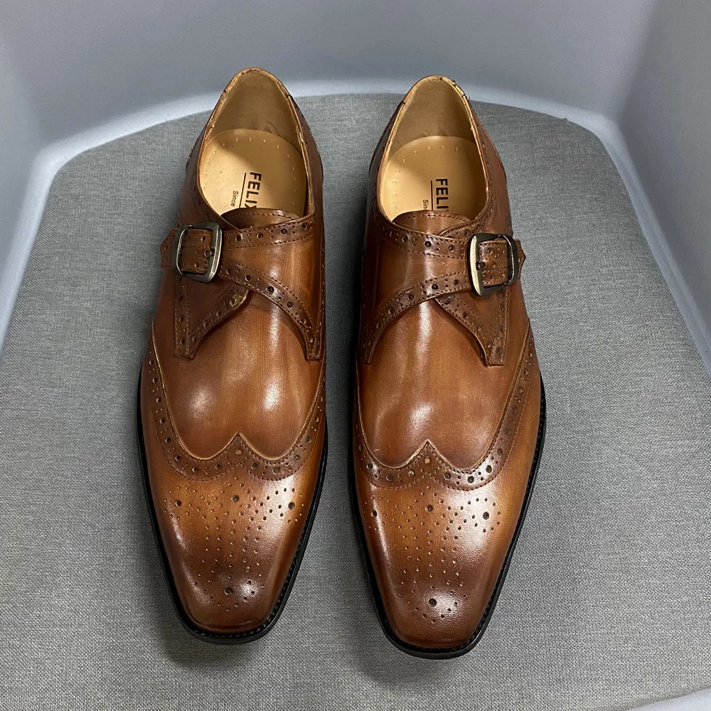 Men’s Luxury Genuine Leather Wingtip Oxfords Italian Monk Strap Buckle Brogue Dress Shoes for Business Wedding Formal Wear