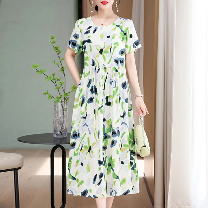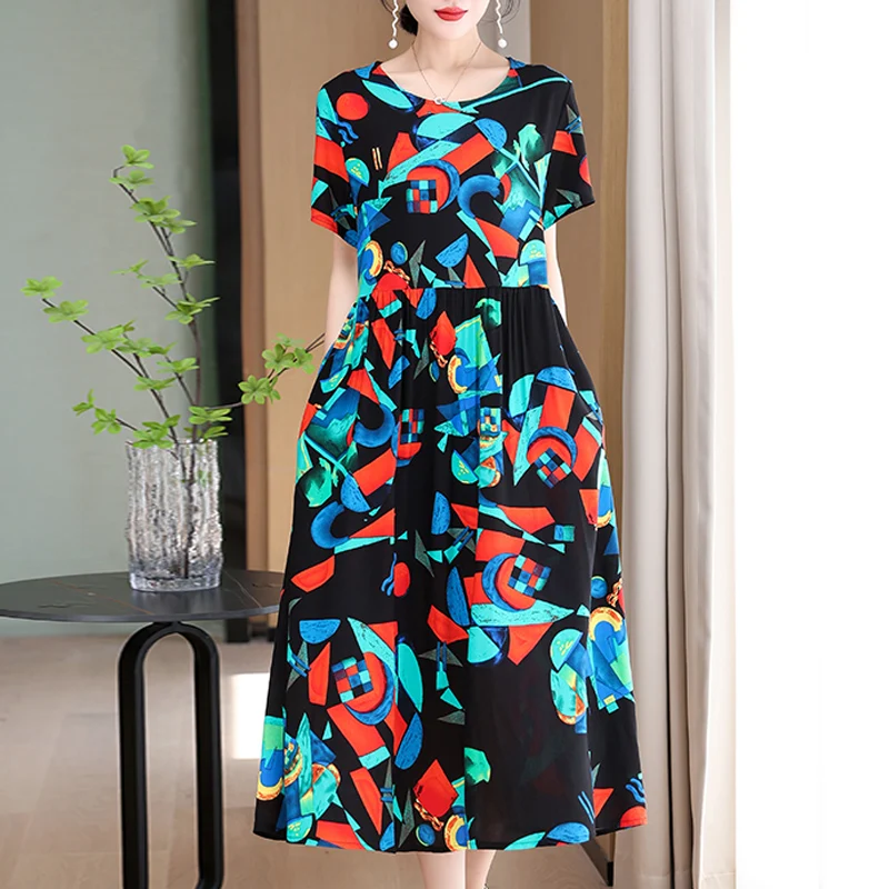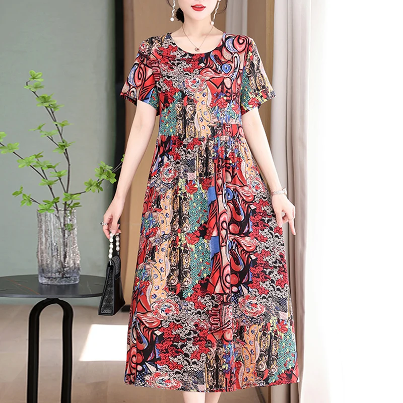 New Fashion 2025 Summer Dresses for Women Plus Size O-neck Dress Print Vintage Short Straight Natural Dresses Women Clothing