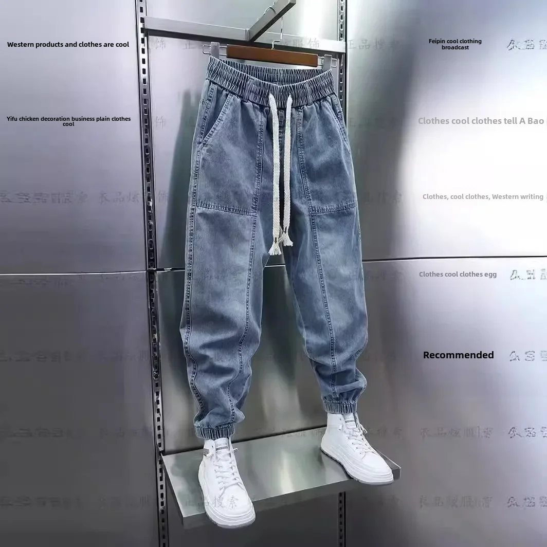 New Men’s Jeans Loose Fit Blue Harem Trousers Trendy Versatile Elastic Waist Cropped Pants Spring Autumn 2024