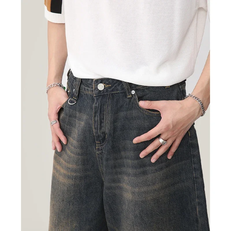 Summer Men Capri Short Jeans Male Fashion Retro Blue Denim Mid Pants Korean Casual Baggy Straight Wide Leg Calf Length Pants