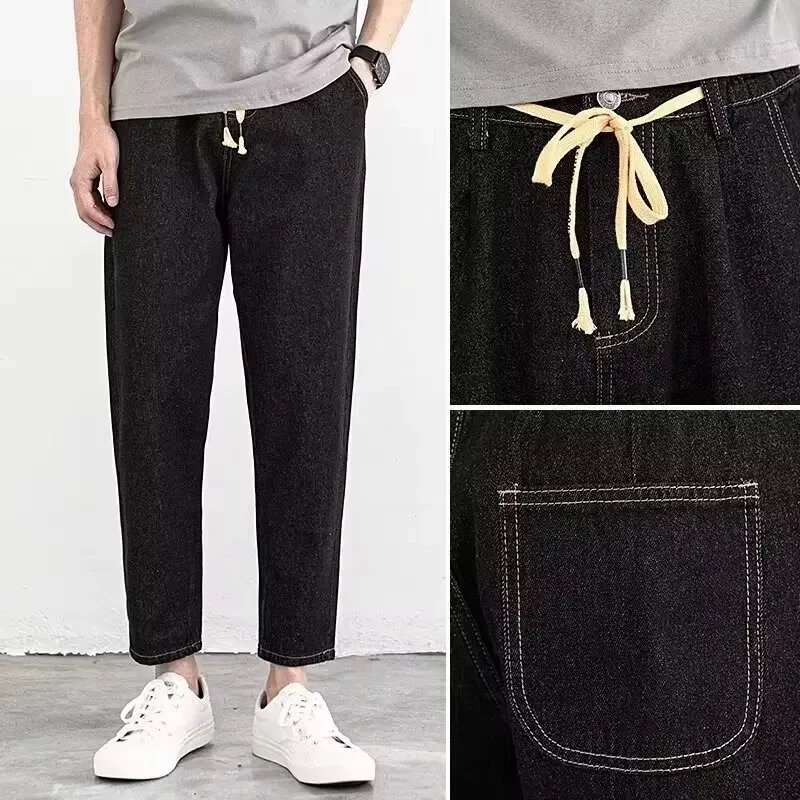Summer Thin Elastic Waist Jeans For Men Trendy Loose-fit Straight-leg Cropped Pants Korean Style Fashion Light Color Pants