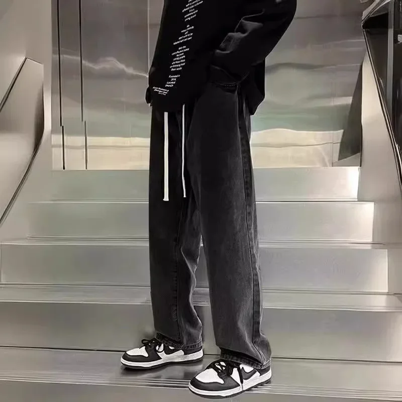 Trendy Elastic Waist Jeans Loose Fit Straight Leg Wide Leg Casual Pants New 2024 Model For Men And Women High Street Style