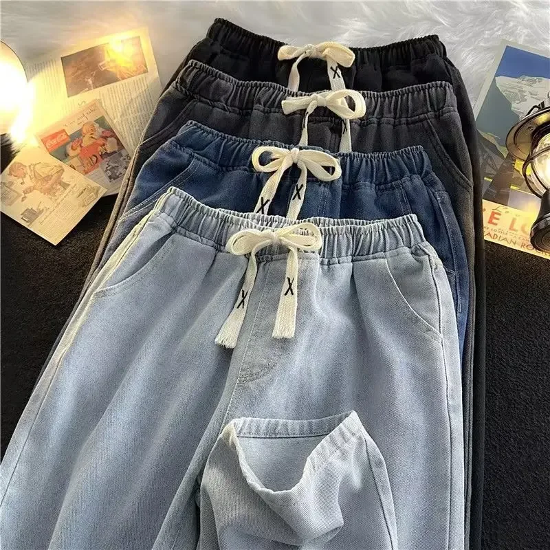 Trendy Elastic Waist Jeans Men’s Loose-Fit Straight-Leg Wide-Leg Spring Autumn Casual Pants Blue Long Pants