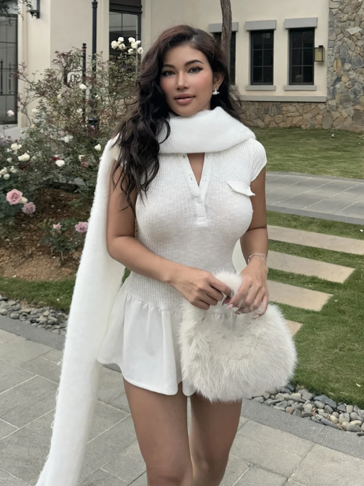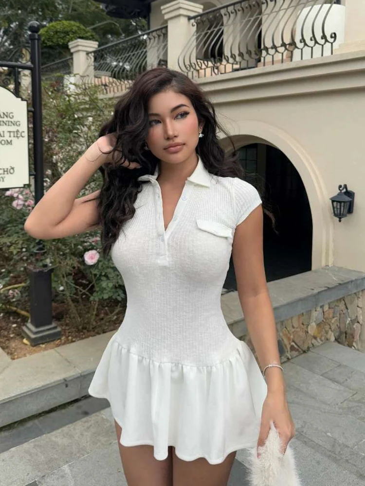 Weird Puss Elegant Women Dress 2025 Summer Simple Patchwork Polo-Neck Short Sleeve Ruffles Hem Stretch Streetwear Mini Bodycon