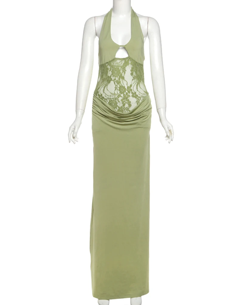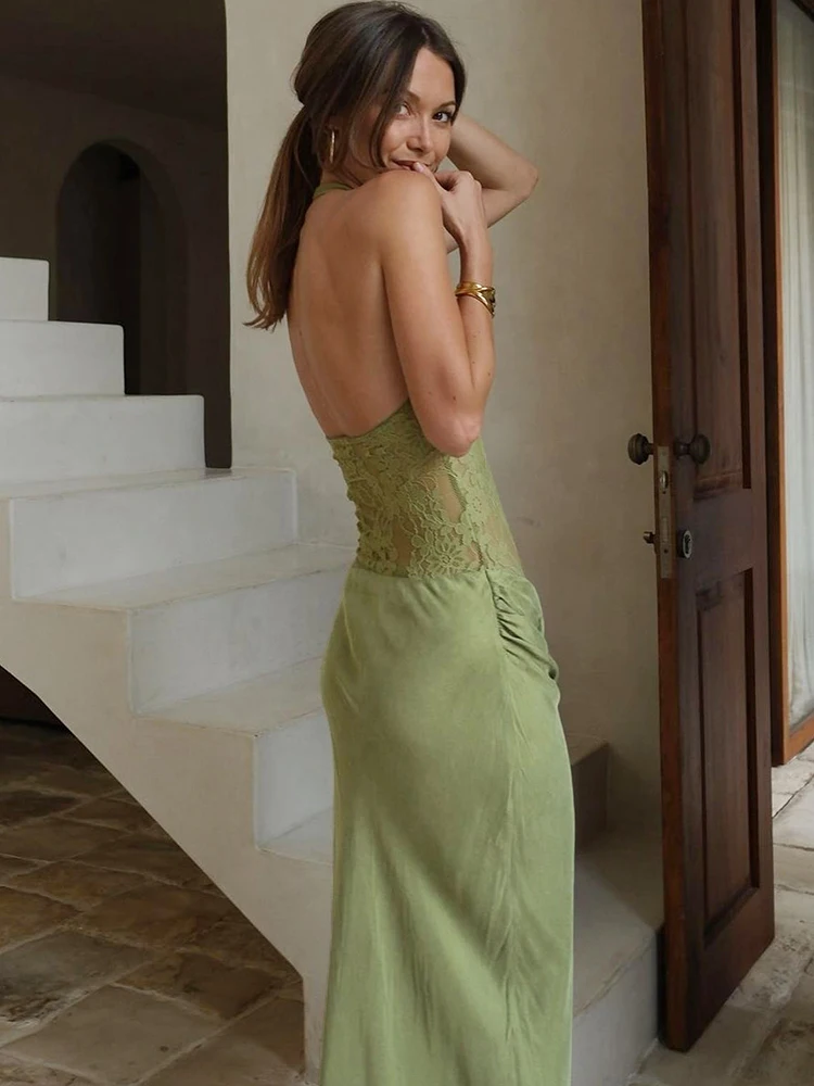 Weird Puss Jacquard Lace Dress Women Hollow Backless Ruched Patchwork Halter Backless Sleeveless Deep V-Neck Y2K Elegant Bodycon