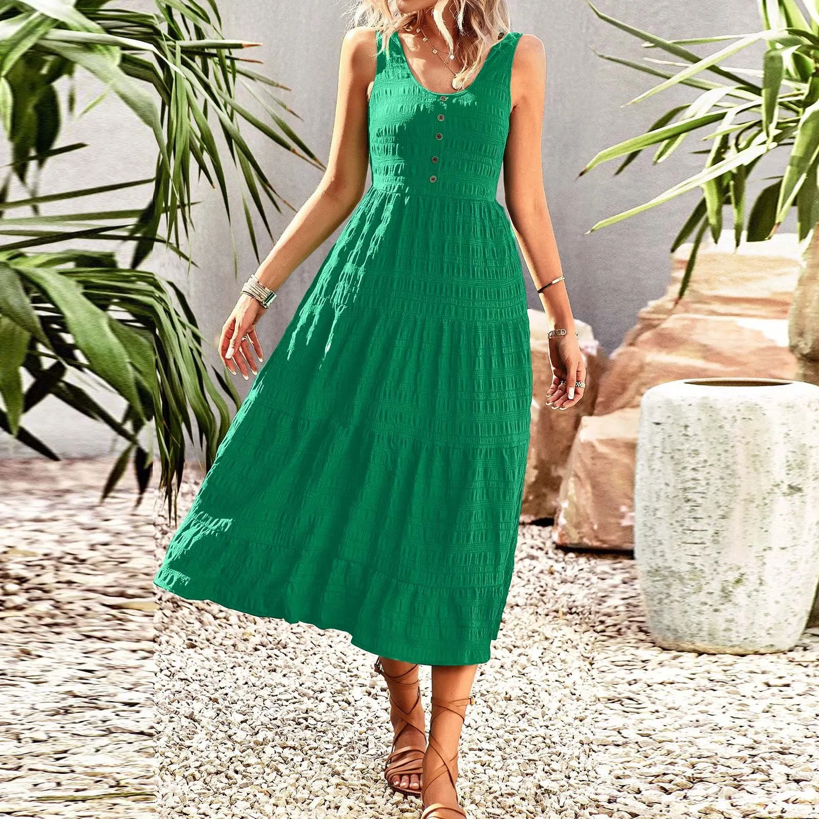 Womens Casual Summer Dress Loose Sleeveless Tank Dresses Smocked Tiered Flowy Midi With Pockets White Dress For Beach Vacation