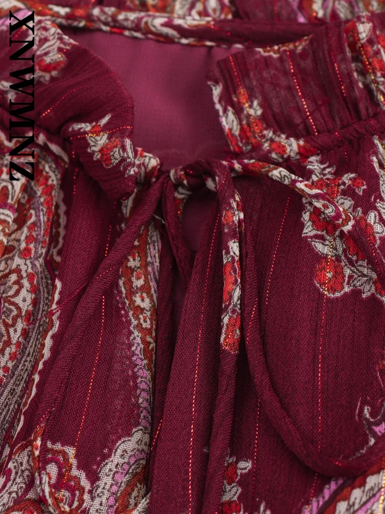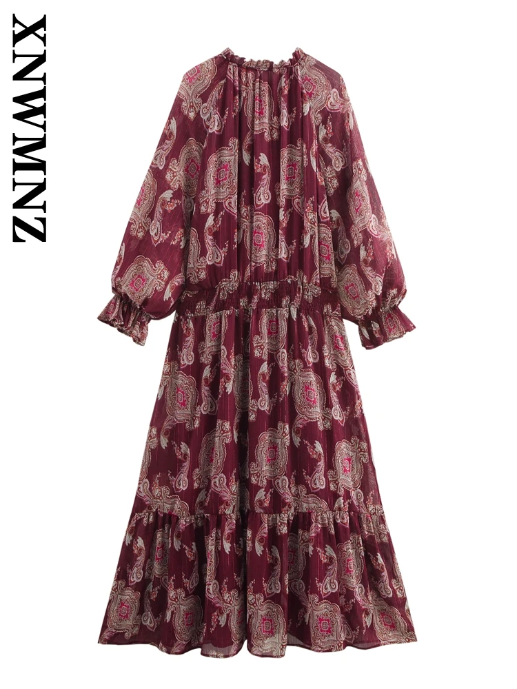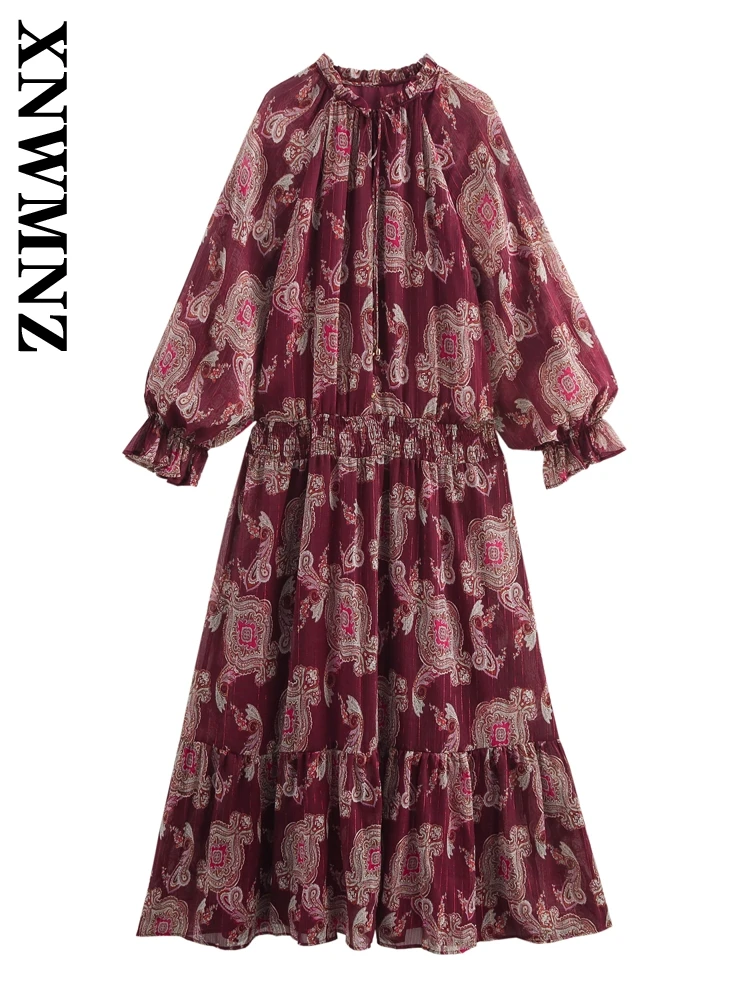 XNWMNZ 2025 Spring Woman Casual Long Sleeve Midi Skirt Top Trendy Female V-Collar Dress Print Regular Fit Lace Dresses Floral