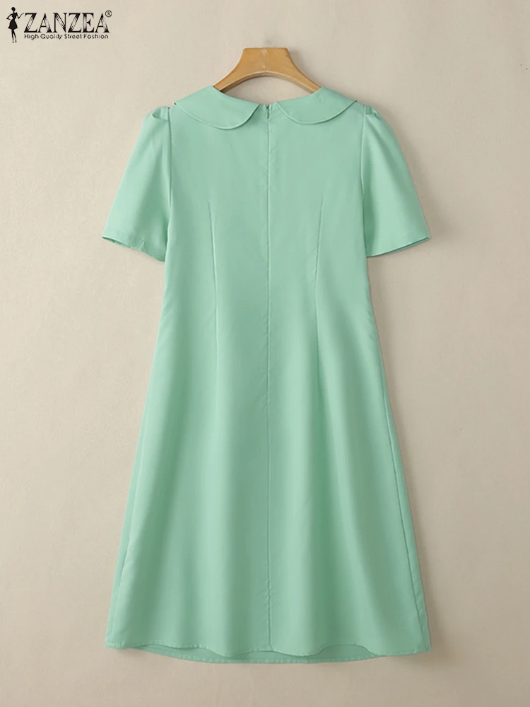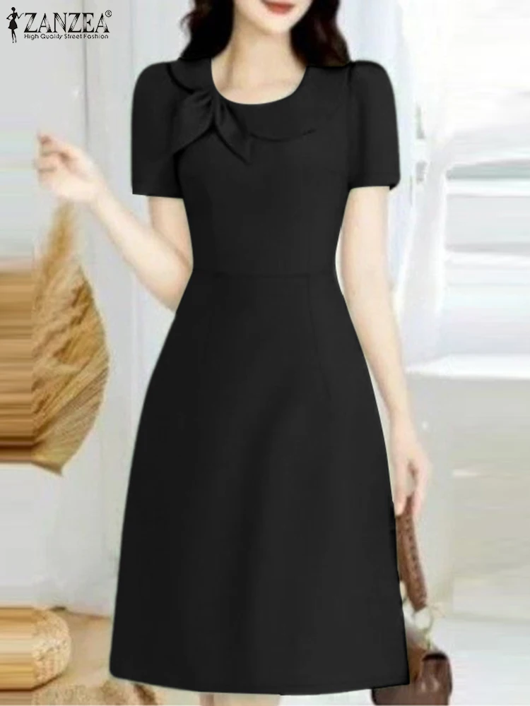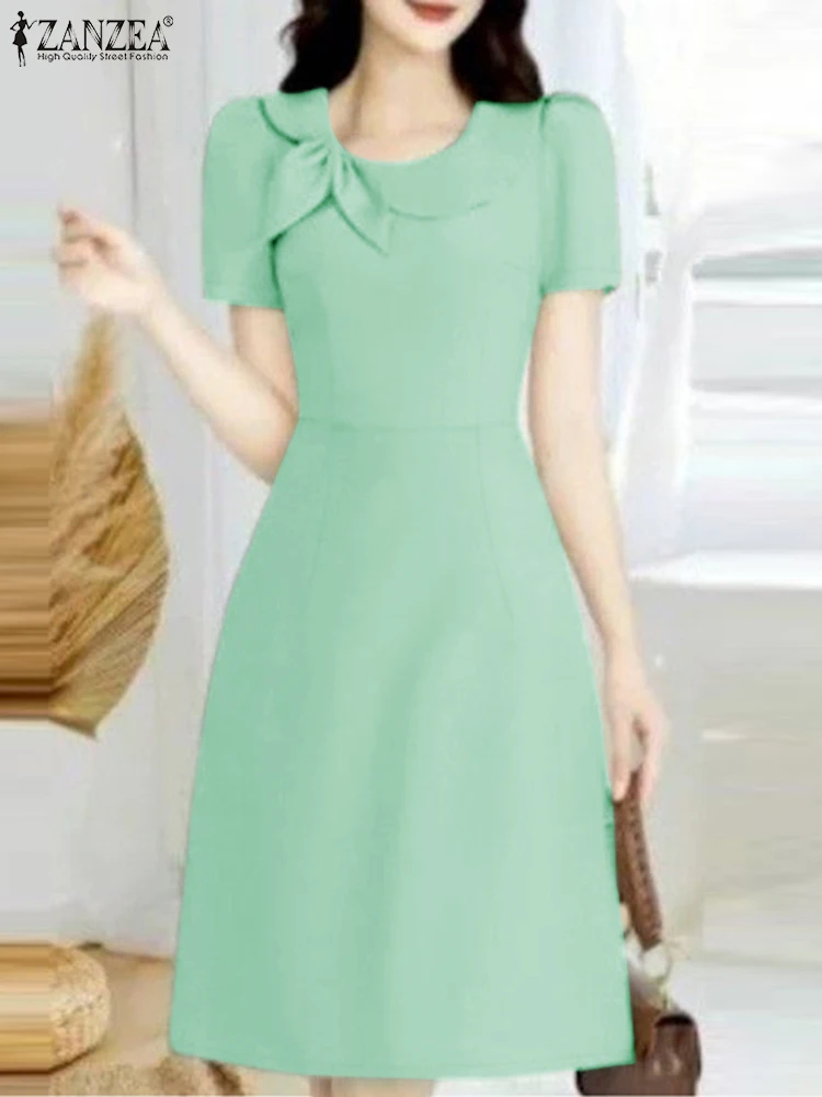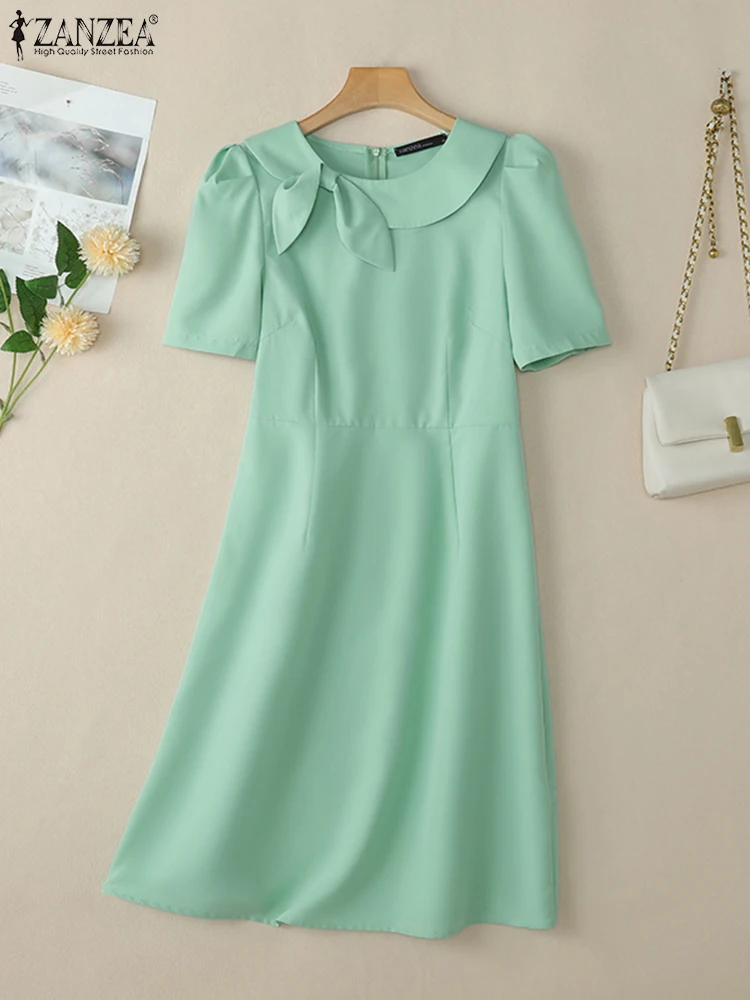 ZANZEA Elegant Women Party Vestidos Casual High Waisted Solid Midi Dress Short Puff Sleeve 2025 Summer Tied Collar A-line Robe